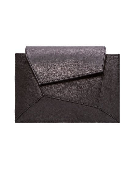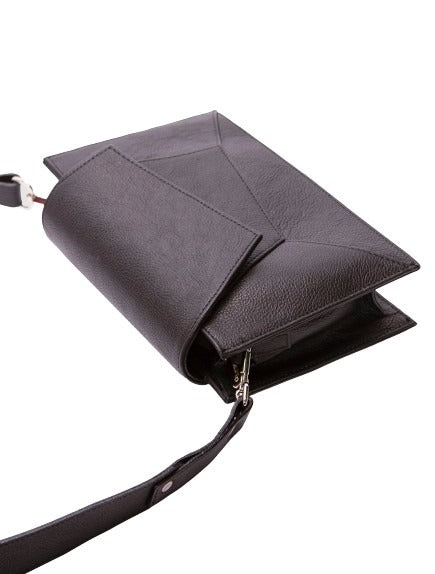 Bandolera semi rígida en cuero vacuno de grano fino y flexible. Su diseño geométrico añade volumen, y la correa larga desmontable permite usarla también como sobre. Cierre con broche imán y herrajes plateados con la estampa de la marca.