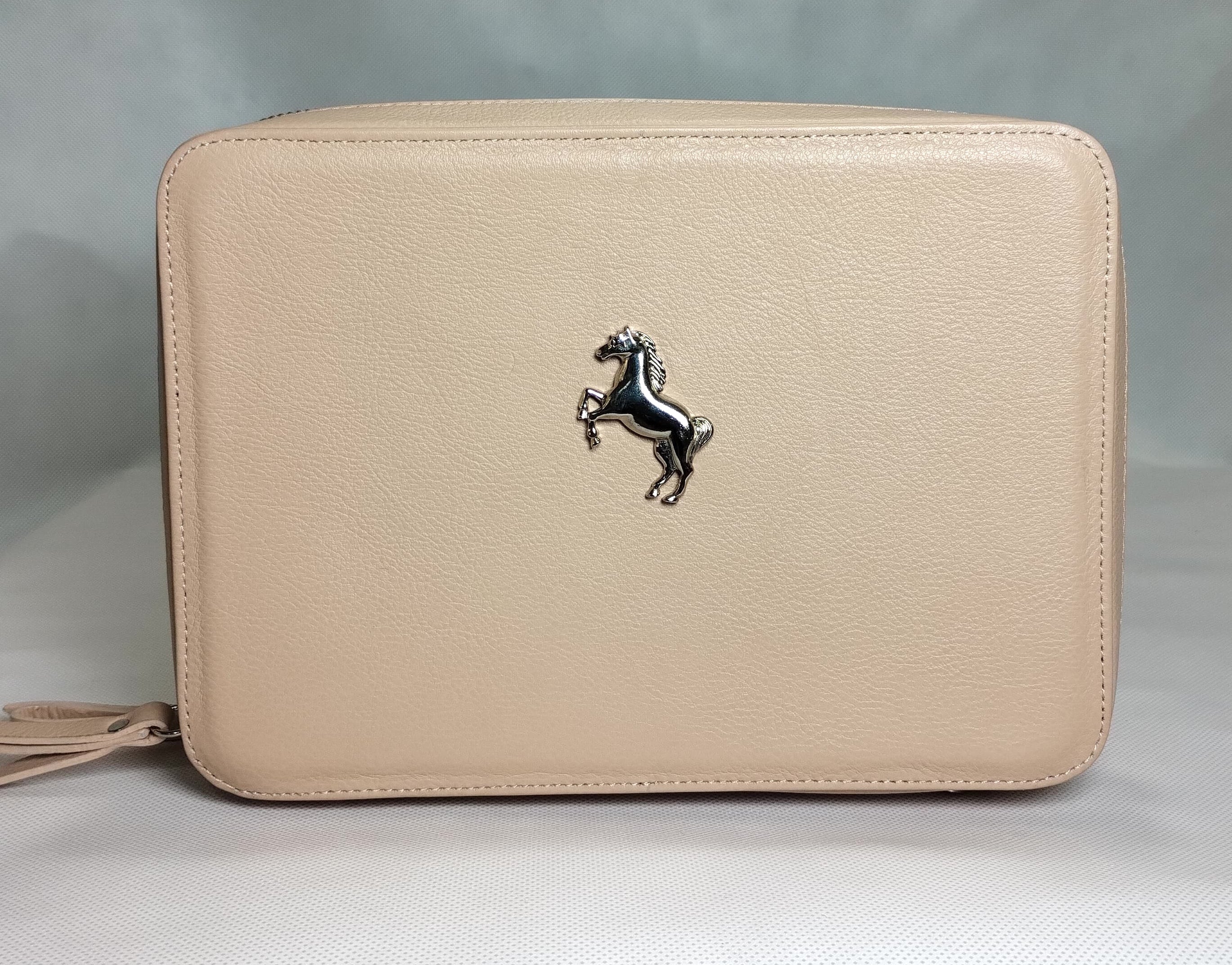 Cartera Med Skye en cuero vacuno con grano fino. Diseño mediano con doble cierre superior y correa ajustable.
